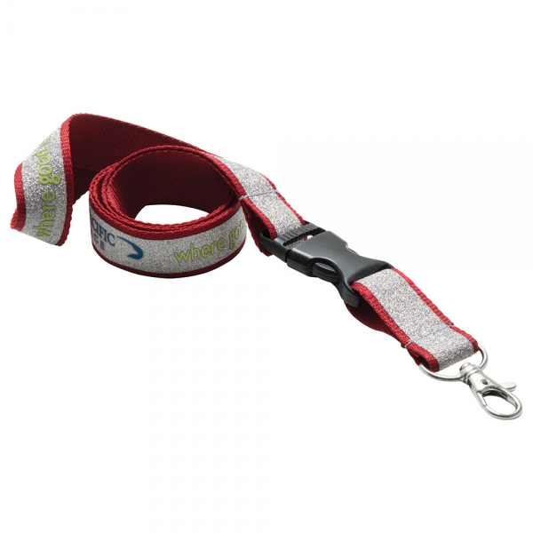A fabulous polyester lanyard featuring a glitter covered strip on 1 side screen printed with up to 4 spot colours.