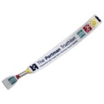 A UK-made recycled PET event wristband with a dye sublimation CMYK print on 1 side. This method of printing is perfect for creating vibrant and detailed full colour designs.