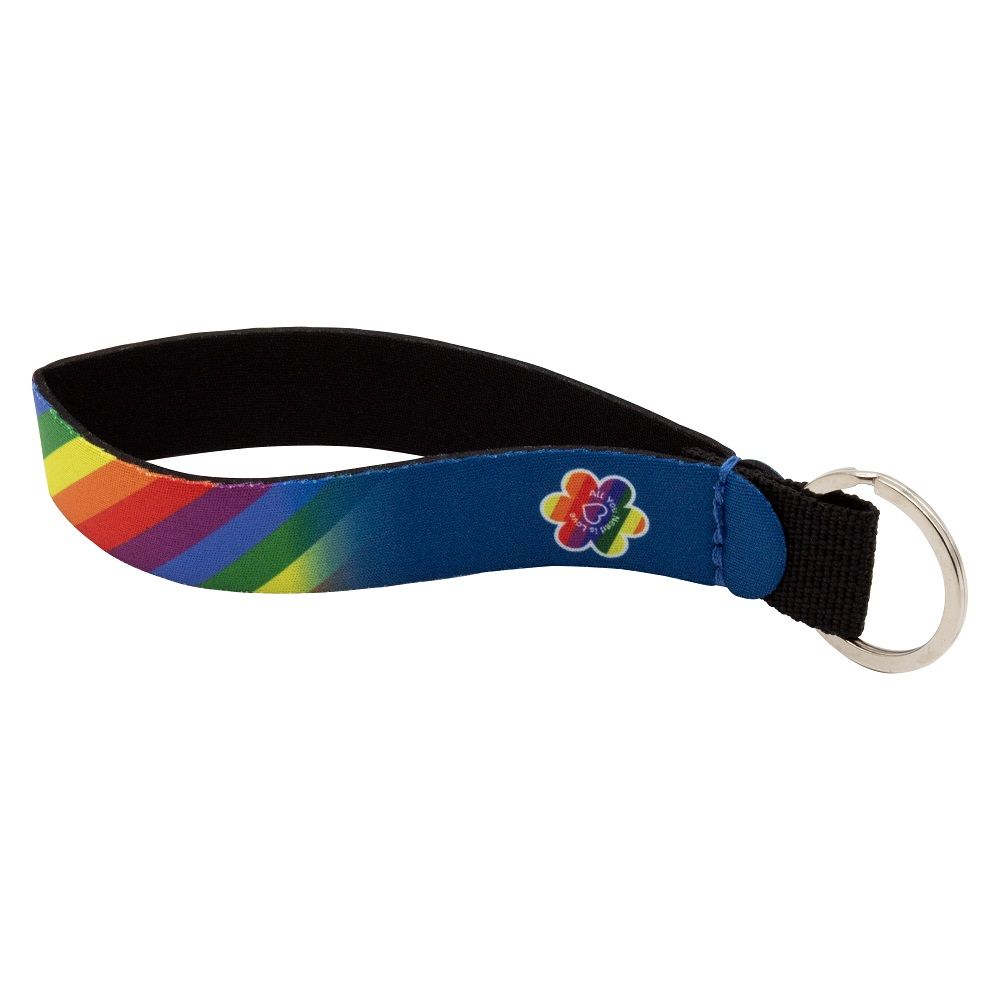 A neoprene wristband keyring with a dye sublimation CMYK print. This method of printing is perfect for creating vibrant and detailed full colour designs.