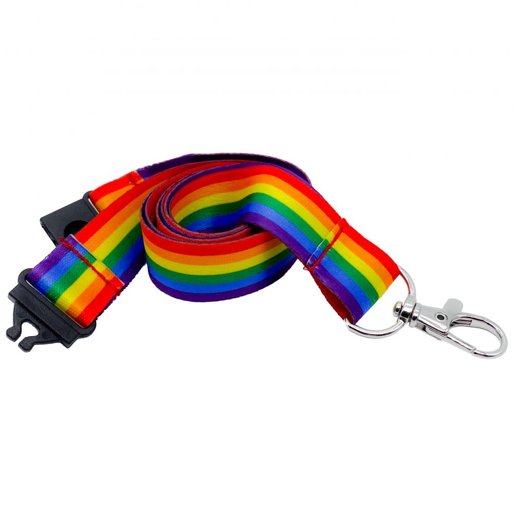 A UK-stocked 20mm recycled PET lanyard dye sublimation printed with pride rainbow colours, available plain next-day or with a 1 colour screen print on 1 side or a full colour transfer print on 1 side in 8-10 working days.
