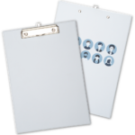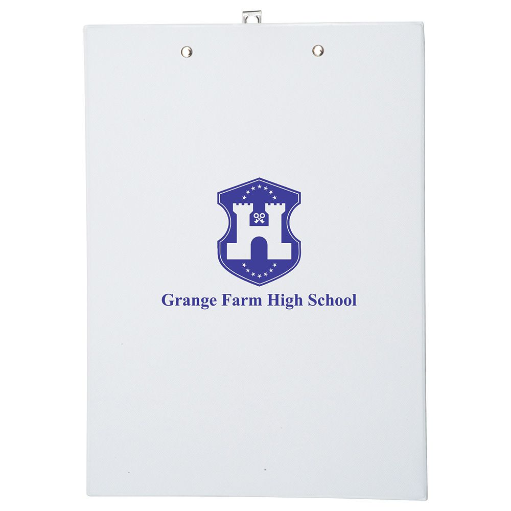 An A4 PVC clipboard available plain next-day or with a screen or full colour transfer print on the back in 8-10 working days. Ideal for holding loose papers while writing on the move.