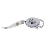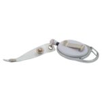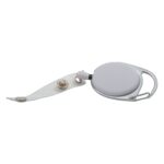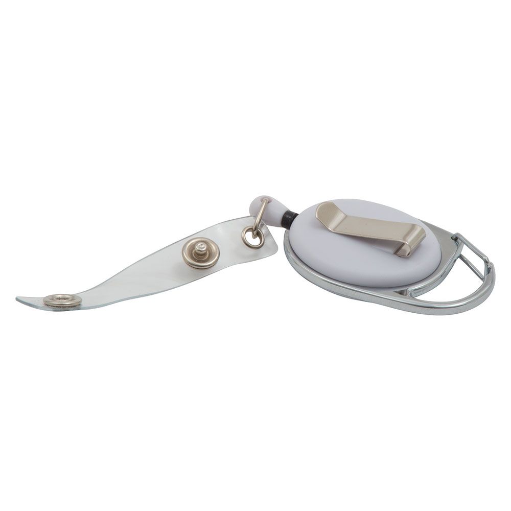 Fitted with a retractable reel featuring a clear vinyl strap and press stud clip. A metal belt-clip on the reverse allows the pull reel to be easily attached to a belt or pocket.