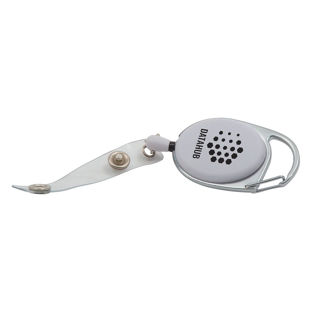 A UK-stocked carabiner pull reel available plain next-day or with a screen or full colour print on 1 side in 8-10 working days. This plastic pull reel has a metal trim with a sturdy built-in carabiner clip ideal for connecting it to a belt loop. It is perfect for holding a PVC wallet or rigid card holder. It can also help carry pre-punched plastic cards as well as keys and other small items.