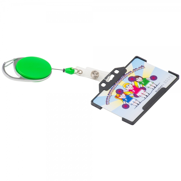 A carabiner pull reel screen printed on 1 side. This plastic pull reel has a metal trim with a sturdy built-in carabiner clip ideal for connecting it to a belt loop. It is perfect for holding a PVC wallet or rigid card holder. It can also help carry pre-punched plastic cards as well as keys and other small items.