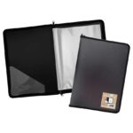 Fitted with a secure zip closure. A clear corner pocket inside the front cover allows for additional storage.