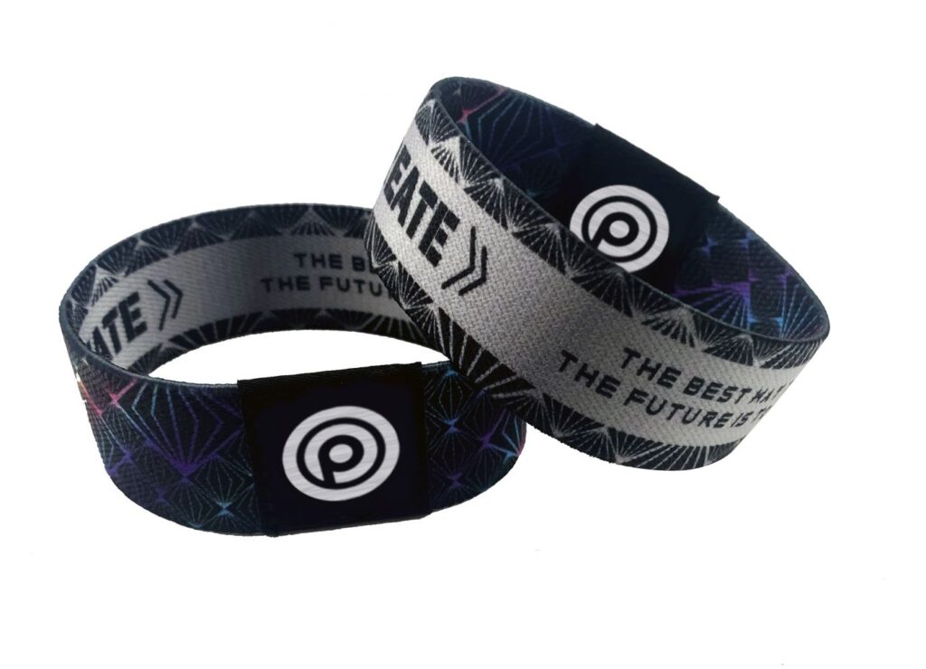 A high-quality reusable elastic fabric wristband personalised with a full colour print on both sides and a custom single-colour woven label. This method of printing allows for detailed and vibrant designs while the woven label offers a unique and attractive way to display additional artwork.