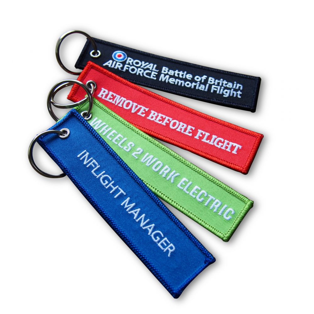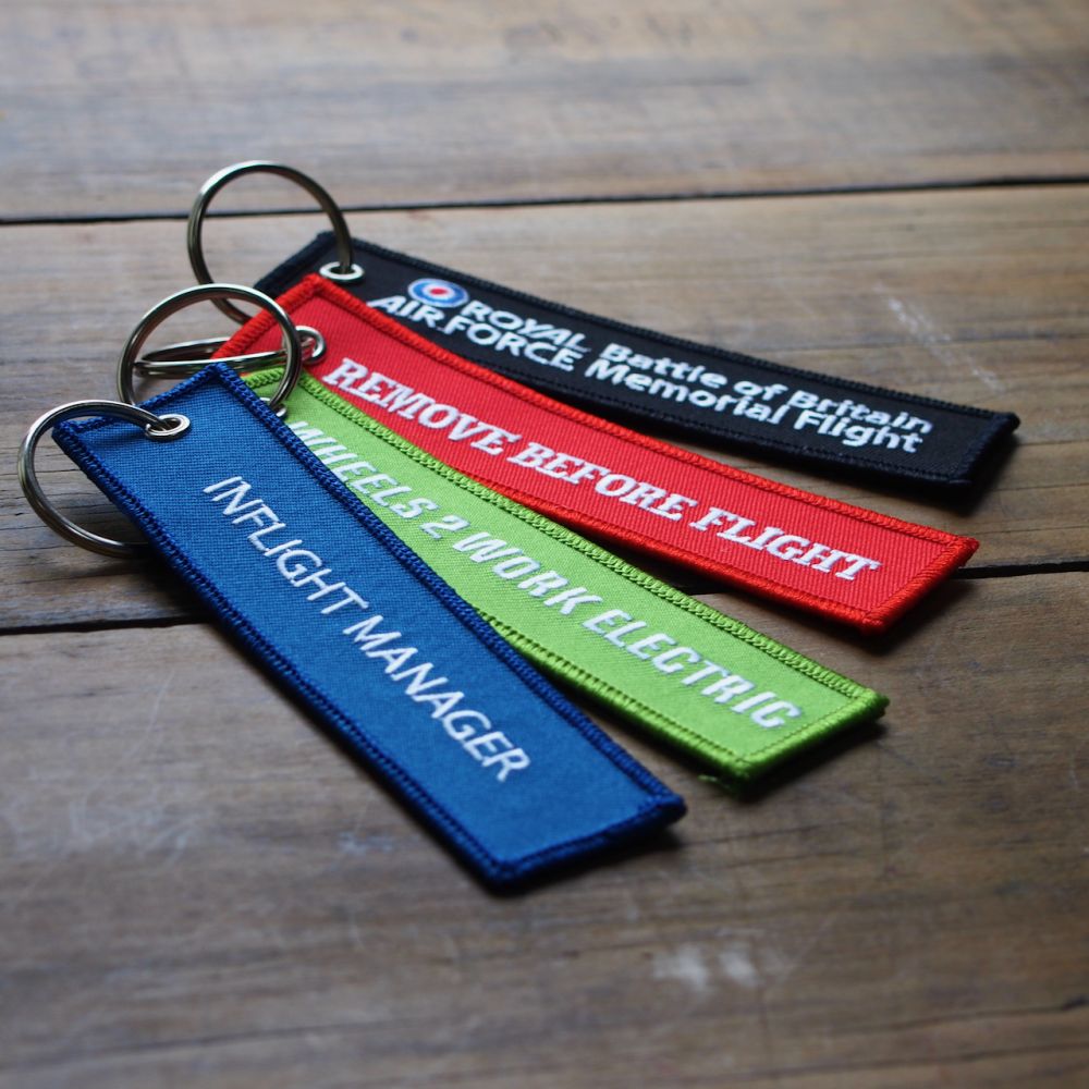A polyester ‘remove before flight’-style tag personalised with embroidered artwork on both sides (designs can differ on each side). Perfect for aviation enthusiasts. Embroidery threads thick fabric on top of the smooth base material and is ideal for creating a bold and textured tag. Embroidered links will be visible between letters and separate parts of the artwork.