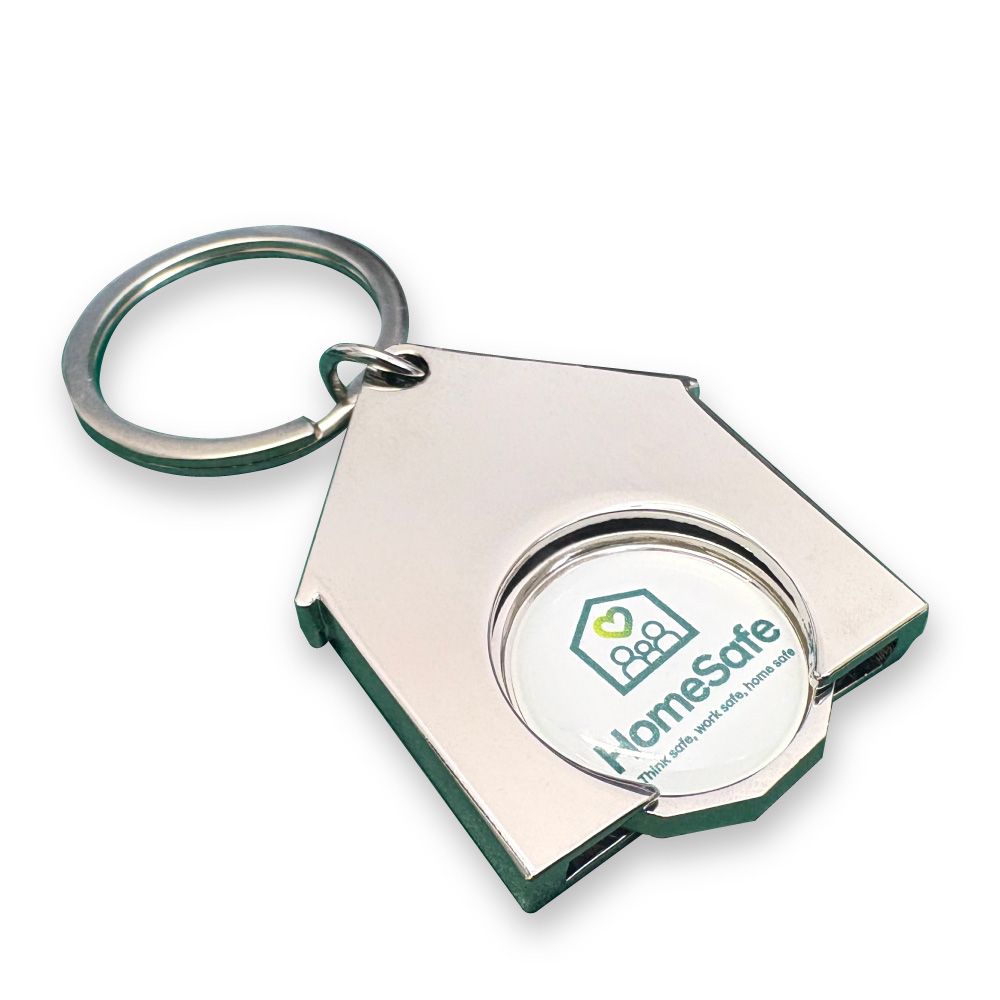 A stamped coin be included at an additional cost with a full colour printed decal on 1 side. Decals are ideal for vibrant designs and are enhanced and protected by a glossy and hard-wearing domed epoxy coating. This house-shaped holder is perfect for promoting mortgage companies or building societies as well as estate and letting agencies.