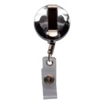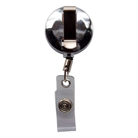 Fitted with a retractable reel featuring a clear vinyl strap and press stud clip. A metal belt-clip on the reverse allows the pull reel to be easily attached to a belt or pocket.