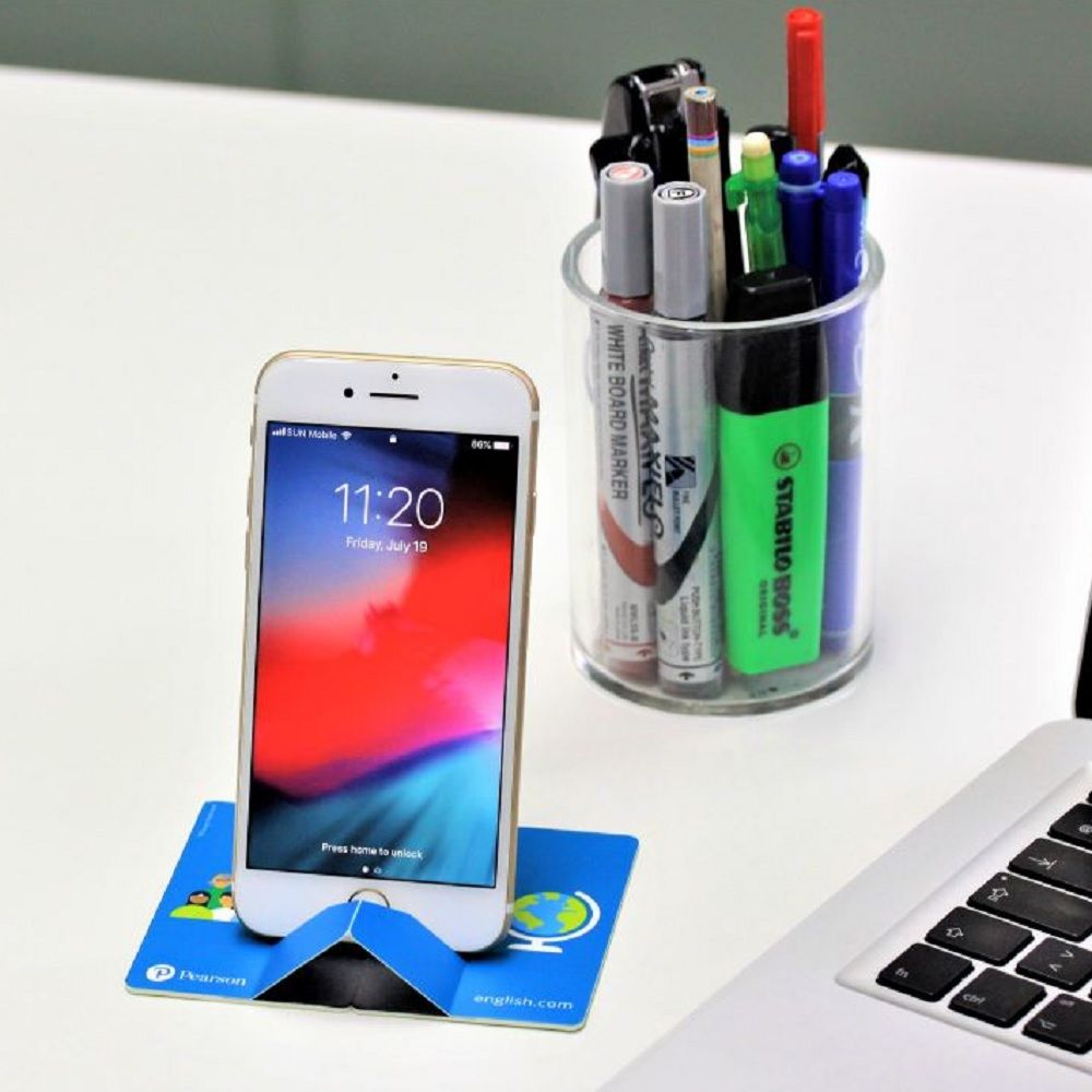 A beautifully made pop up phone stand printed full colour. The inner panel is made of a single sheet of recycled paper cardboard allowing continuous printed designs. Premium construction for a long lasting, often used desk top promotion.