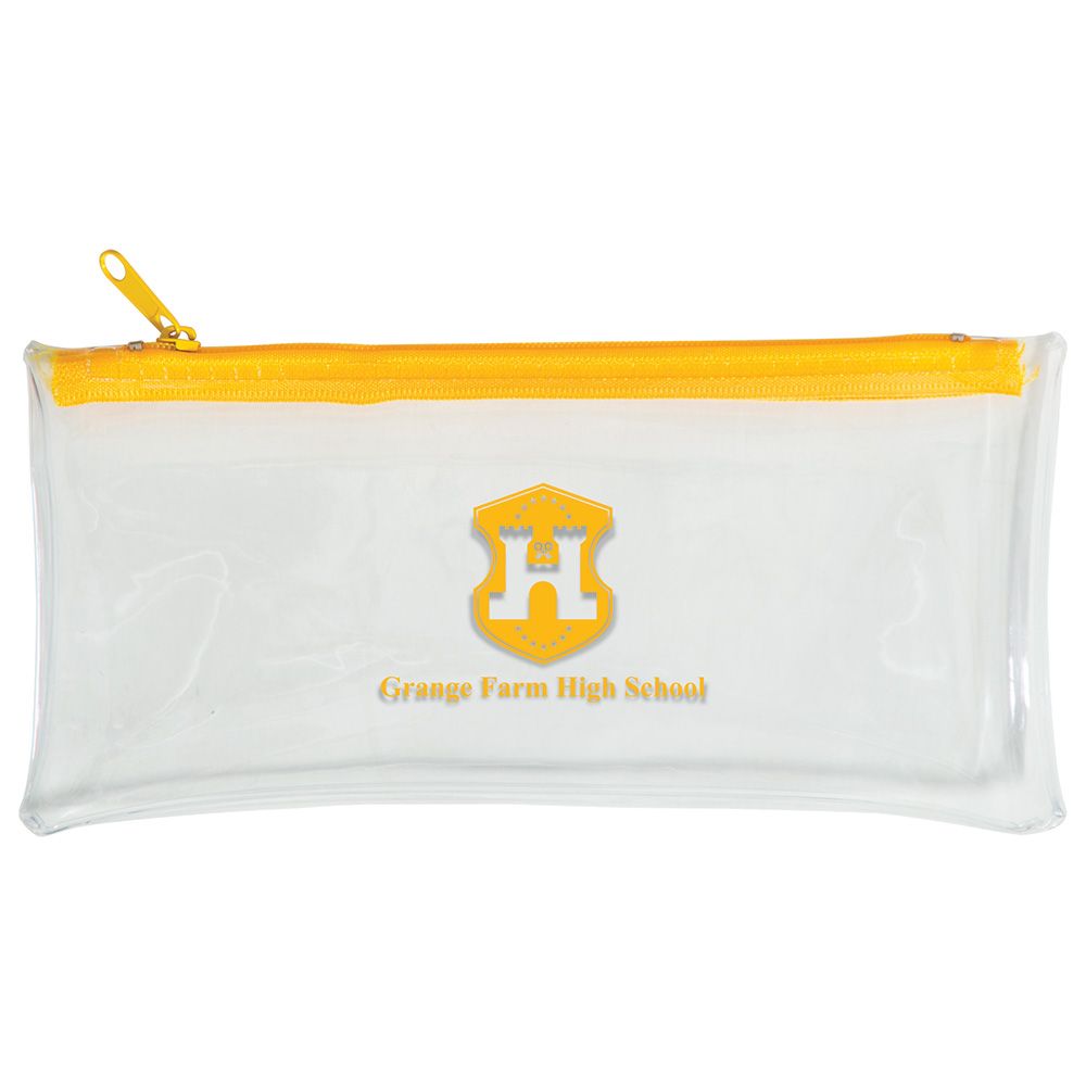 An exam-suitable UK-stocked clear PVC pencil case. Available plain next-day or screen printed on 1 or both sides in 8-10 working days. Durable 0.3mm-thick PVC is lightweight but tear-resistant and water-repellent.