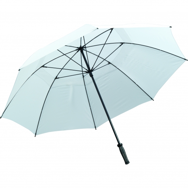 A sturdy UK-stocked 30-inch vented golf umbrella with a soft but durable polyester pongee canopy. This waterproof 8-panel canopy has vents that make the umbrella easier to use in windy conditions and a velcro closure. Available plain next-day or printed in 8-10 working days.